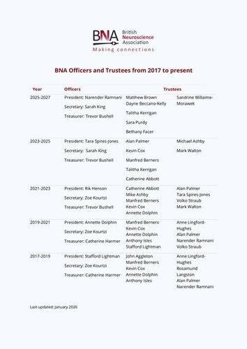 In more recent decades, prominent neuroscientists such as Trevor Robbins, David Nutt, Russell Foster, Irene Tracey, Anne Lingford-Hughes, Rik Henson and Tara Spires-Jones have played key roles within the BNA, contributing scientific leadership across areas spanning cognition, mental health, sleep, neuroimaging and neurodegeneration. Together, these individuals reflect the breadth, excellence and continued evolution of the neuroscience community represented by the BNA.