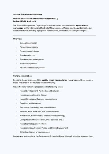 The BNA2027 Programme Organising Committee invites submissions for symposia and workshops for the International Festival of Neuroscience. Please read the guidelines below carefully before submitting a proposal. For enquiries, contact [email protected].